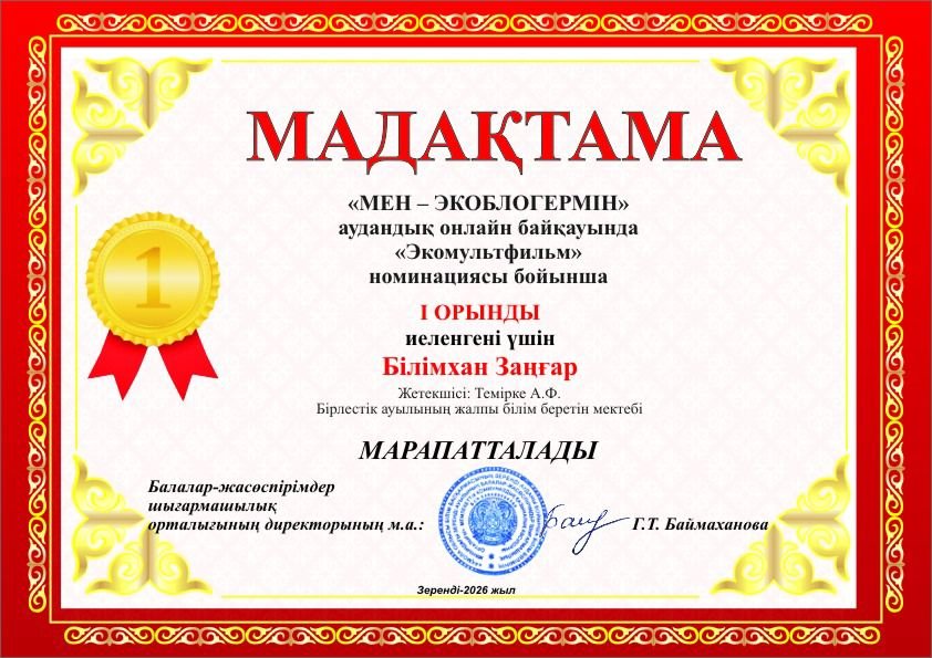 Облыстық «Мен-экоблогермін» онлайн байқауының «Экомультфильм» номинациясы бойынша мектебіміздің 8-сынып оқушысы Білімхан Заңғар аудандық кезеңінде 1-орынды, облыстық кезеңде 2-орынды иеленді.