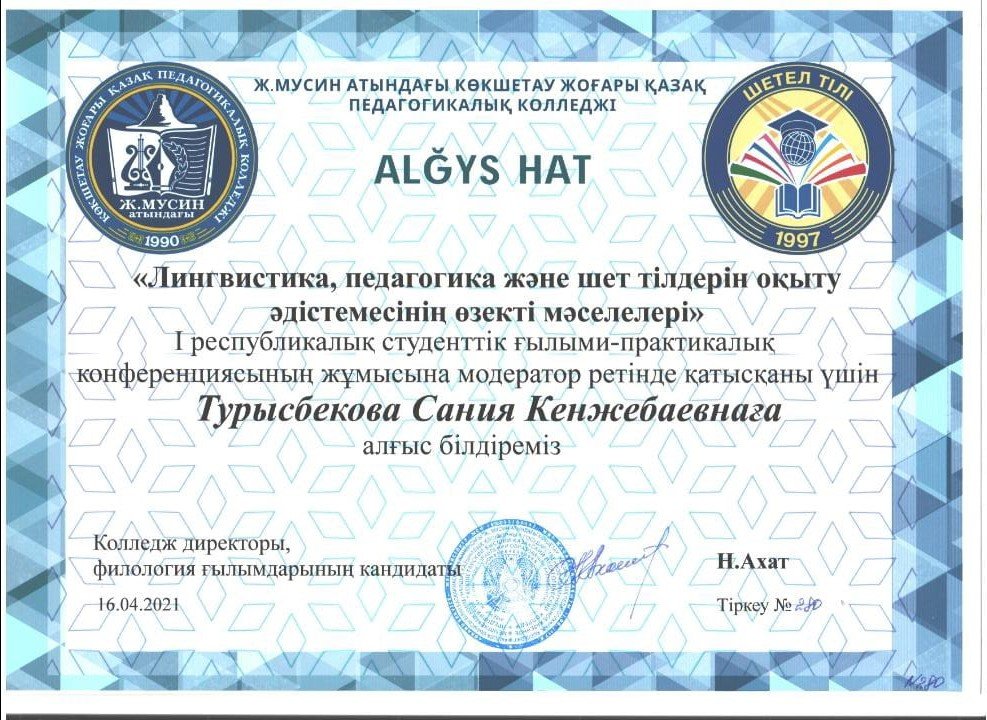 Ағылшын тілі мұғалімі Турысбекова Сания Кенжебайқызының Көкшетау қаласы, Ж.Мусин қазақ педагогикалық колледжінің атынан алған алғыс хат қағазымен құттықтаймыз. Алдағы уақытта Сания Кенжебайқызының жұмысына шығармашылық табыс тілейміз.