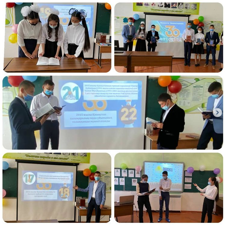 Қазақстан Республикасы Тәуелсіздігінің 30 жылдығына орай Назарбаев Зияткерлік мектебінде "Жасампаздық пен даму жылдары" тақырыбында тәрбие сағаты өтті. Мектебіміздің 10-11 сынып оқушылары онлайн режимде қатысты.