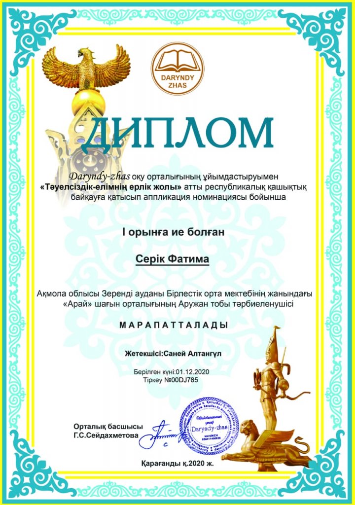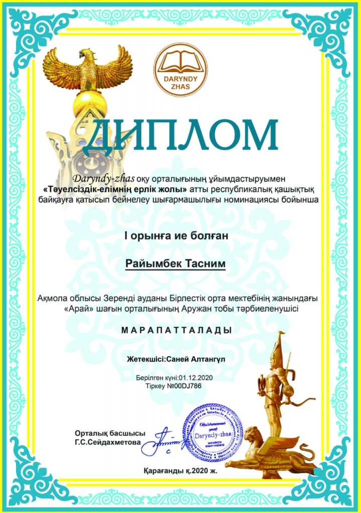 "Дарынды жас" республикалық шығармашылық сайты ұйымдастырған "Тәуелсіздік-елімнің ерлік жолы" атты республикалық қашықтық байқауға қатысып, әртүрлі номинация бойынша І-дәрежелі дипломмен "Арай" шағын орталығының тәрбиеленушіліері Шамухан Асанәлі, Серік Фатима, Райымбек Тасним марапатталды! Құттықтаймыз!