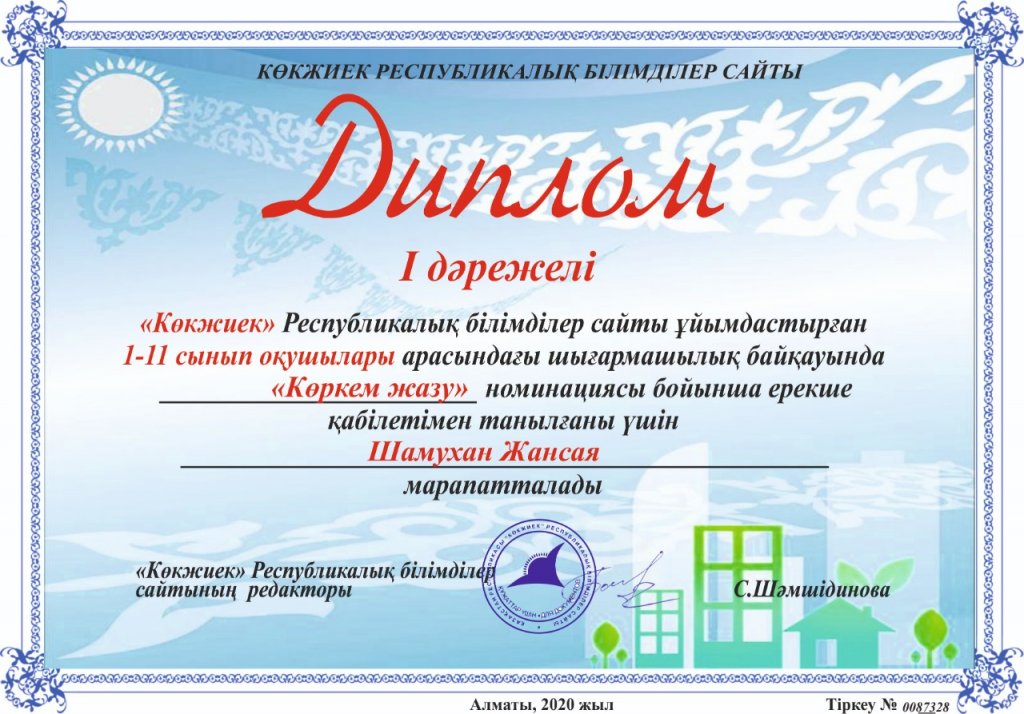 "Көкжиек" Республикалық білімділер сайты ұйымдастырған шағармашылық байқауында "Отбасы-тәрбиенің ұясы" номинациясы бойынша Райымбек Інжу және "Көркем жазу" номинациясы бойынша Шамухан Жансая, Боранбай Төрехан І дәрежелі дипломмен марапатталды! Құттықтаймыз!